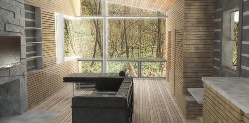 Using the existing log cabin as an anchor, the internal systems have been regulated pushing the kitchen to be in line with the living room and allowing the bedroom the become it’s own private space. Then to adapt to the changes desired and needed by Milton, the home grows.